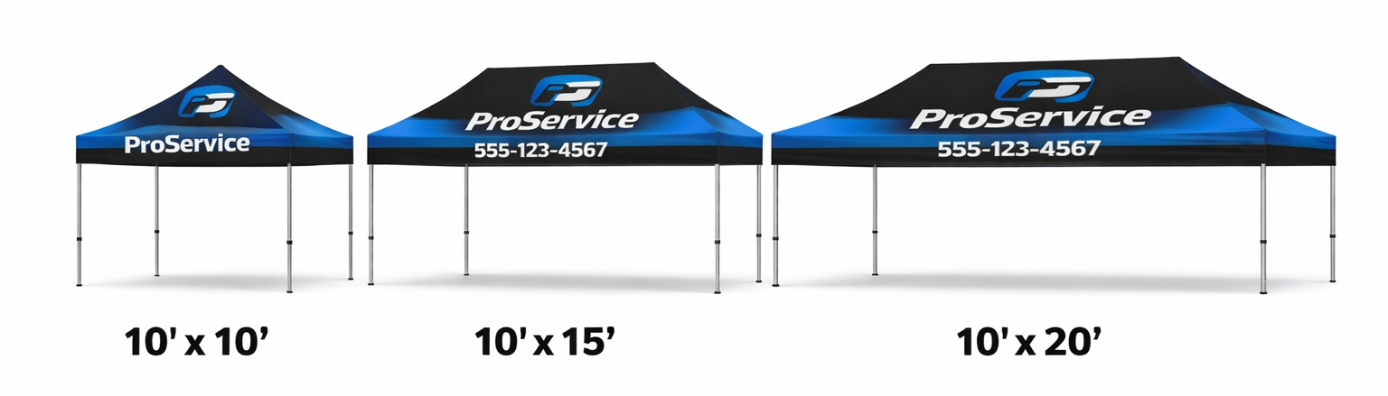 Digitally printed 10′ x 20′ tent with your own logo & design. These incredible displays show off your brand like few other marketing products can. Custom tents are perfect for promoting your brand at trade shows, fairs and events. Our tents are top quality and very easy to setup and take down and include full color print on the top peak as well as all four valances.